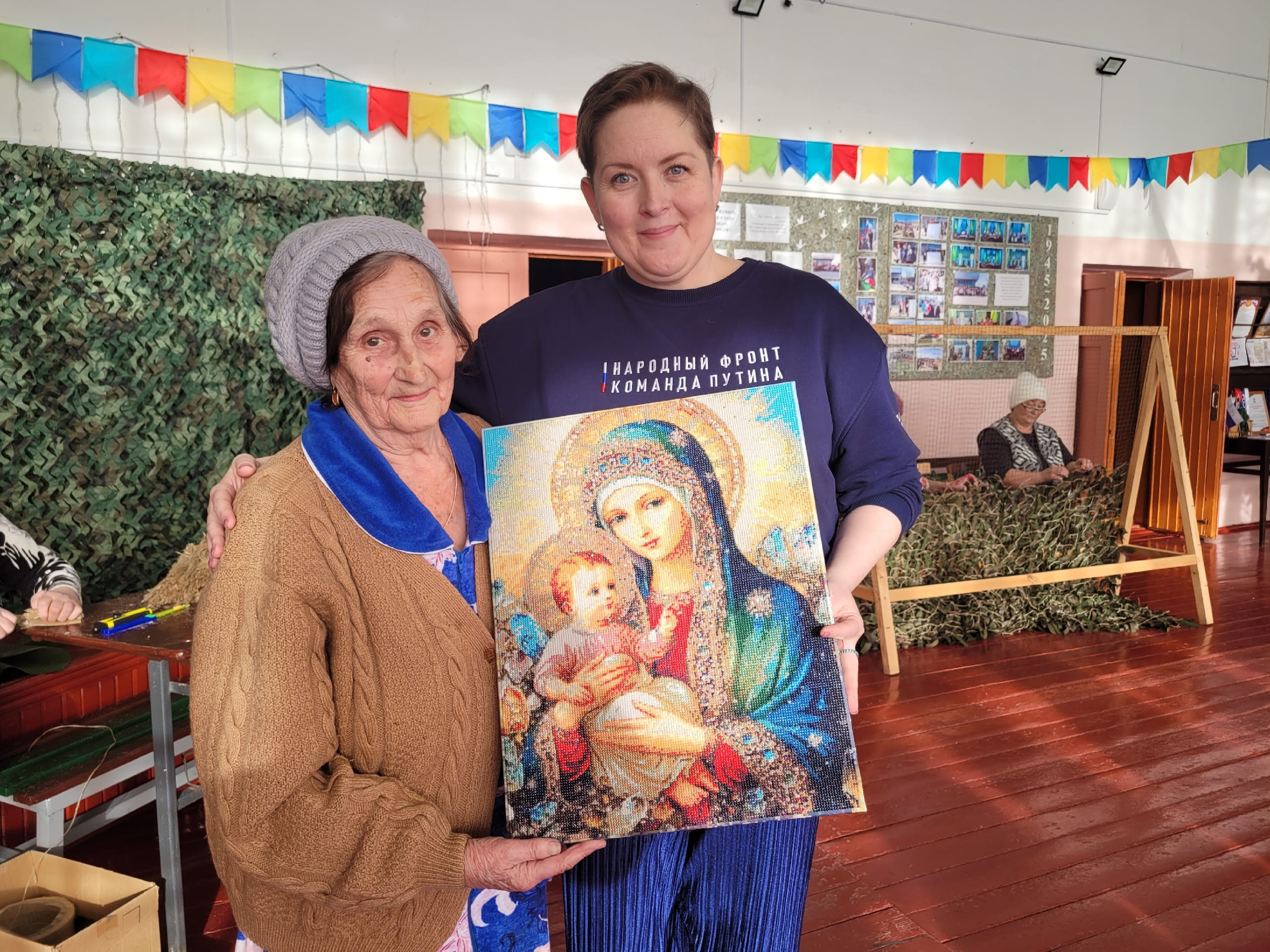 В Байкале, одна из волонтёров — Антонина Емельяновна Тимошенко, ей 88 лет, передала бойцам через Народный фронт икону, которую собрала из алмазной мозаики сама.