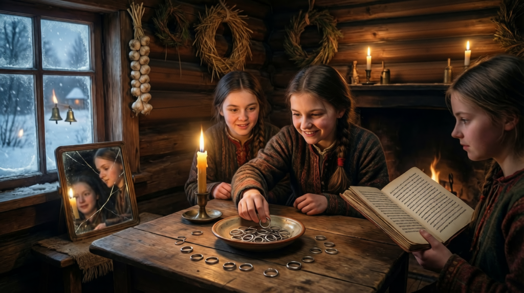 Девушки перед Крещением устраивали гадания, одним из самых распространённых было пение подблюдных песен с предсказаниями. Во время этих песен из блюдца, не глядя, вытаскивали колечки, которые были собраны у всех присутствующих. Существовало множество других способов гадания, некоторые из которых были довольно пугающими. Например, можно было отправиться в тёмную баню со свечой и двумя зеркалами, чтобы вызвать суженого-ряженого на ужин. С наступлением Крещения все эти развлечения прекращались, и каждый, кто участвовал в них, должен был очиститься от грехов, искупавшись в проруби. Православная церковь считала эти весёлые и порой жутковатые обычаи «бесовскими».