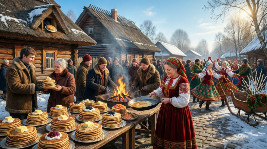Первый блин считался поминальным: его клали на слуховое окно или отдавали нищим, чтобы он достиг предков. Почитание умерших было важной частью Масленицы, как и других зимне-весенних праздников.