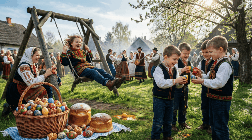 Пасха была временем активных игр и хороводов на свежем воздухе. Одним из самых популярных развлечений было качание на качелях и прыжки на досках. Также было принято обходить дома с поздравлениями, исполняя волочебные песни, и получать в награду яйца, куличи и другие угощения.